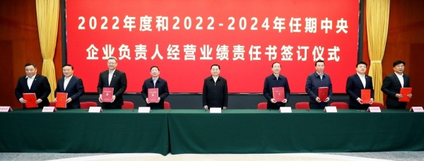 16日国资委召开视频会议通报中央企业一季度经济运行情况,分析形势、压实目标任务,对今年重点工作进行再动员再部署。国资委党委书记、主任郝鹏代表国资委与中央企业负责人签订2022年度和2022—2024年任期经营业绩责任书。