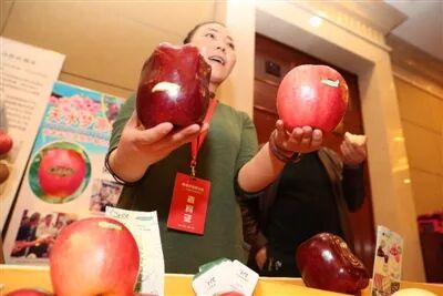 2017年11月4日,秦安县参加了在北京举行的农产品对接会,图为工作人员展示秦安出产的苹果。